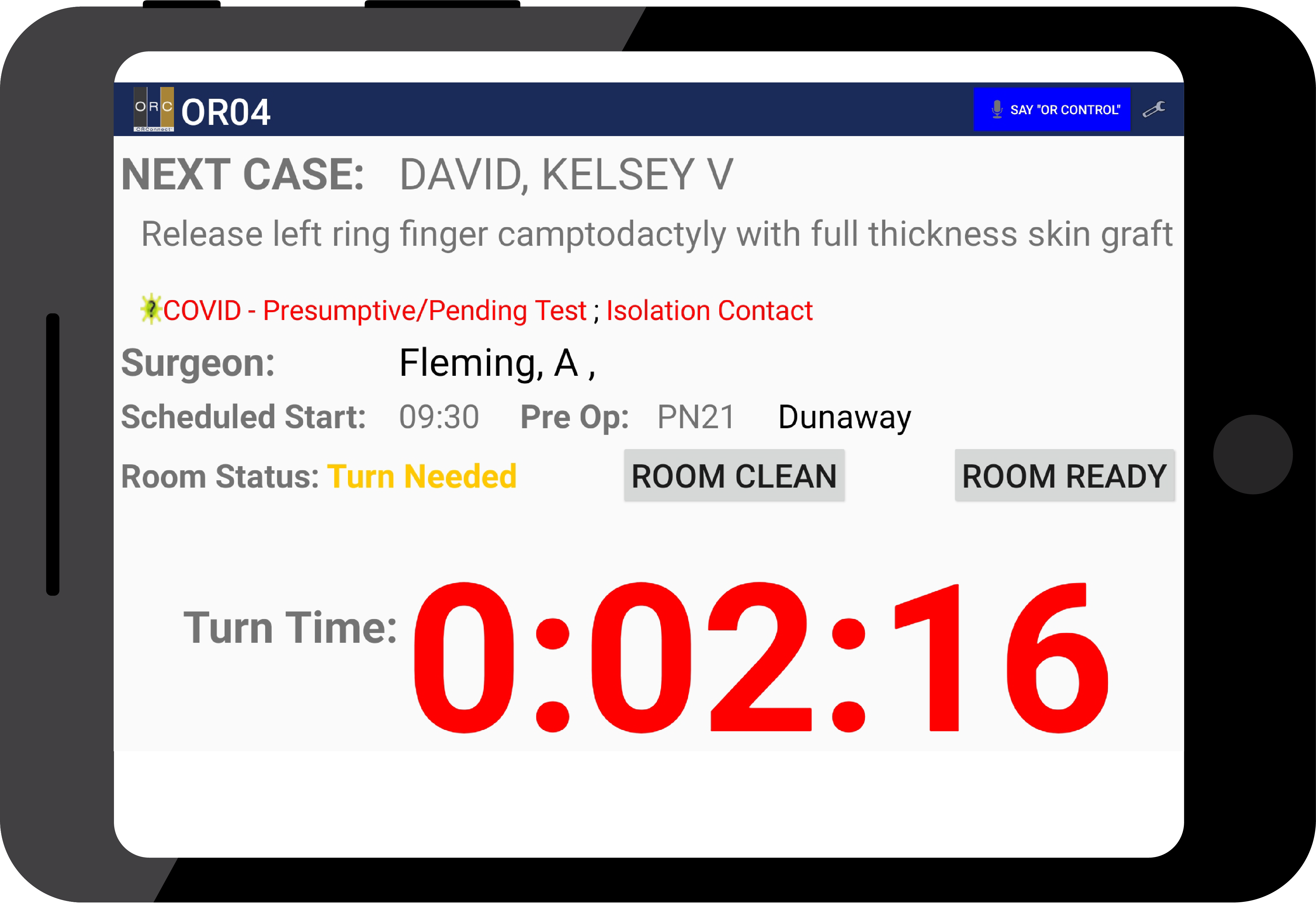ORCONNECT is an ORCONTROL tablet device that is mounted inside each procedure room. It provides quick access to real-time details about the current and next case scheduled for that room, including PreOp and PACU assignments. Room status (such as call for next patient, room clean, or room ready) is easily updated through a single touch or handsfree voice command.